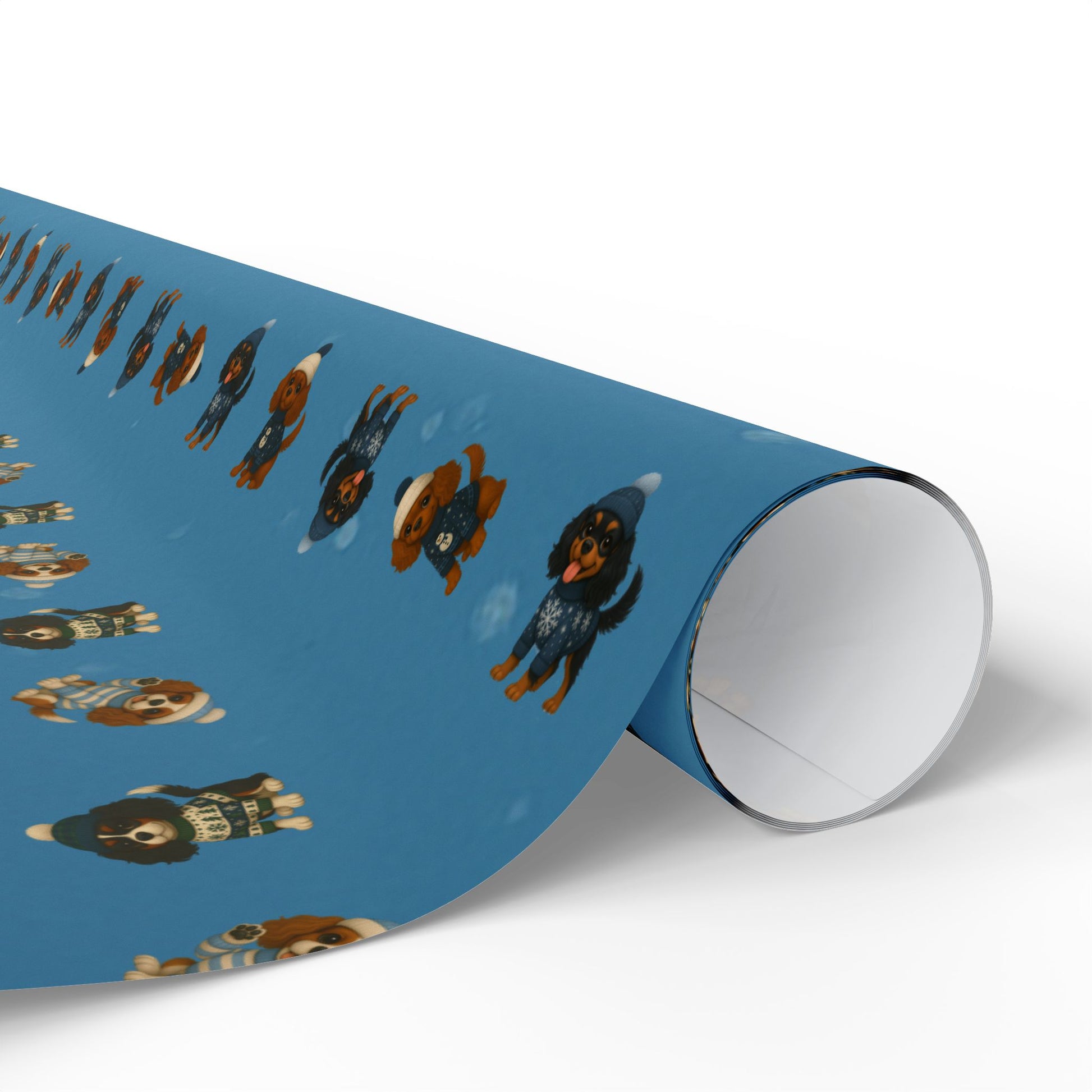 Soft, joyful wrapping paper printed on sturdy 90gsm fine art stock. Tiny, hand-drawn cavalier king charles spaniels march across a dusty blue field, each one sporting a cozy sweater or little accessory, a warm, playful pattern that makes any package feel personal. The print is one-sided with a polished glossy or smooth matte finish, and comes in long, generous rolls so you can wrap gifts for birthdays, winter gatherings, or cozy house visits without seams showing. Subtle white printing edges with a small barcode and QR strip appear at the top and bottom of each roll.