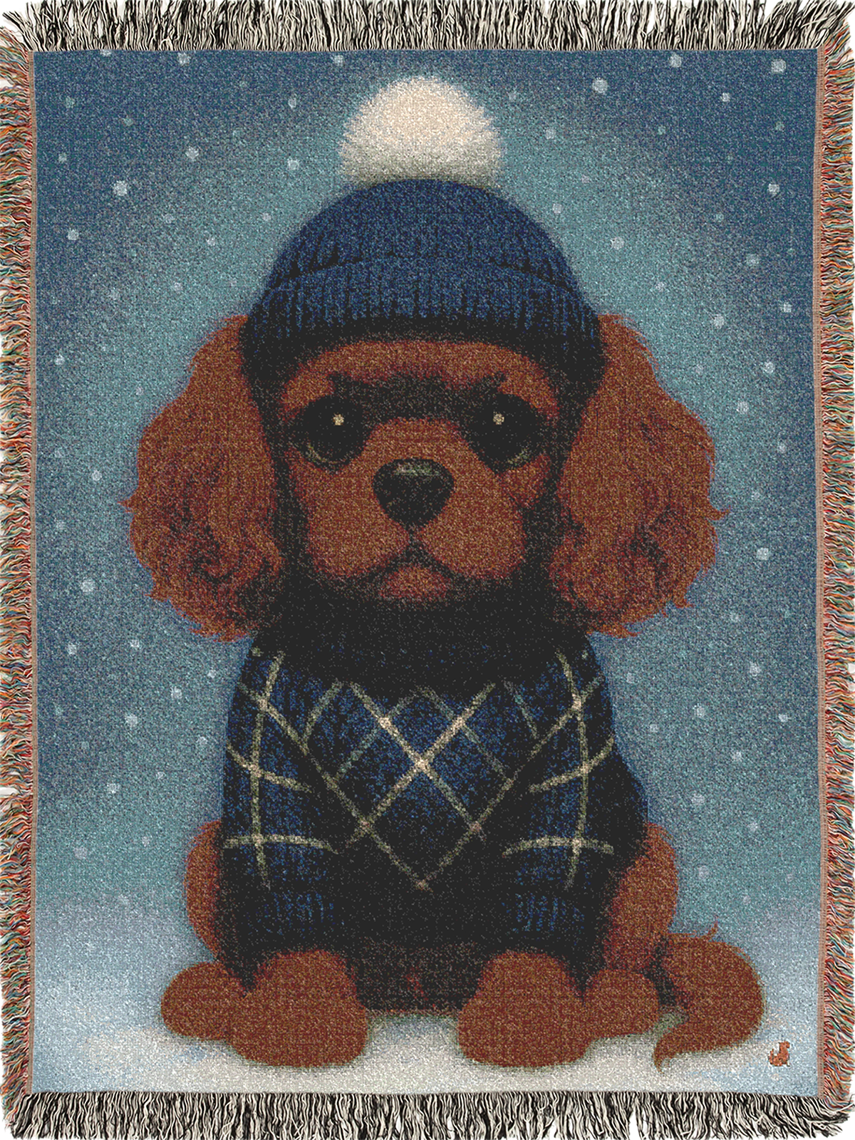 Wrap yourself in cozy charm with Cavy Comfort, a woven blanket that brings warmth, whimsy, and a dash of a Ruby Cavalier's sweetness to your home. Featuring an adorable pup bundled in a winter sweater and beanie, this blanket captures the pure comfort of companionship; perfect for snuggling up on cold nights or adding a touch of joy to your decor.