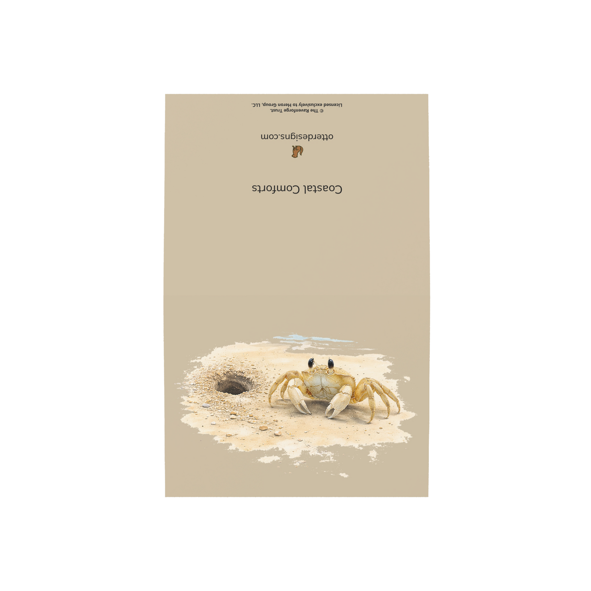 A pale crab pauses beside its burrow in warm sand, captured in a moment of quiet stillness. The scene is rendered in soft coastal tones, grounded and unhurried, with a sense of presence that feels both brief and complete.